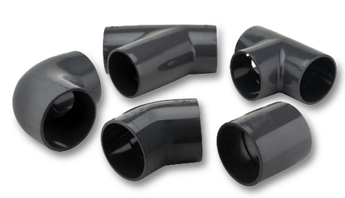 I raccordi in PVC-U di colore grigio per tubazioni in pressione sono classificati PN 16 e si collegano tramite giunzione chimica a freddo, filettatura o flangiatura, in conformità alla ISO 1452.